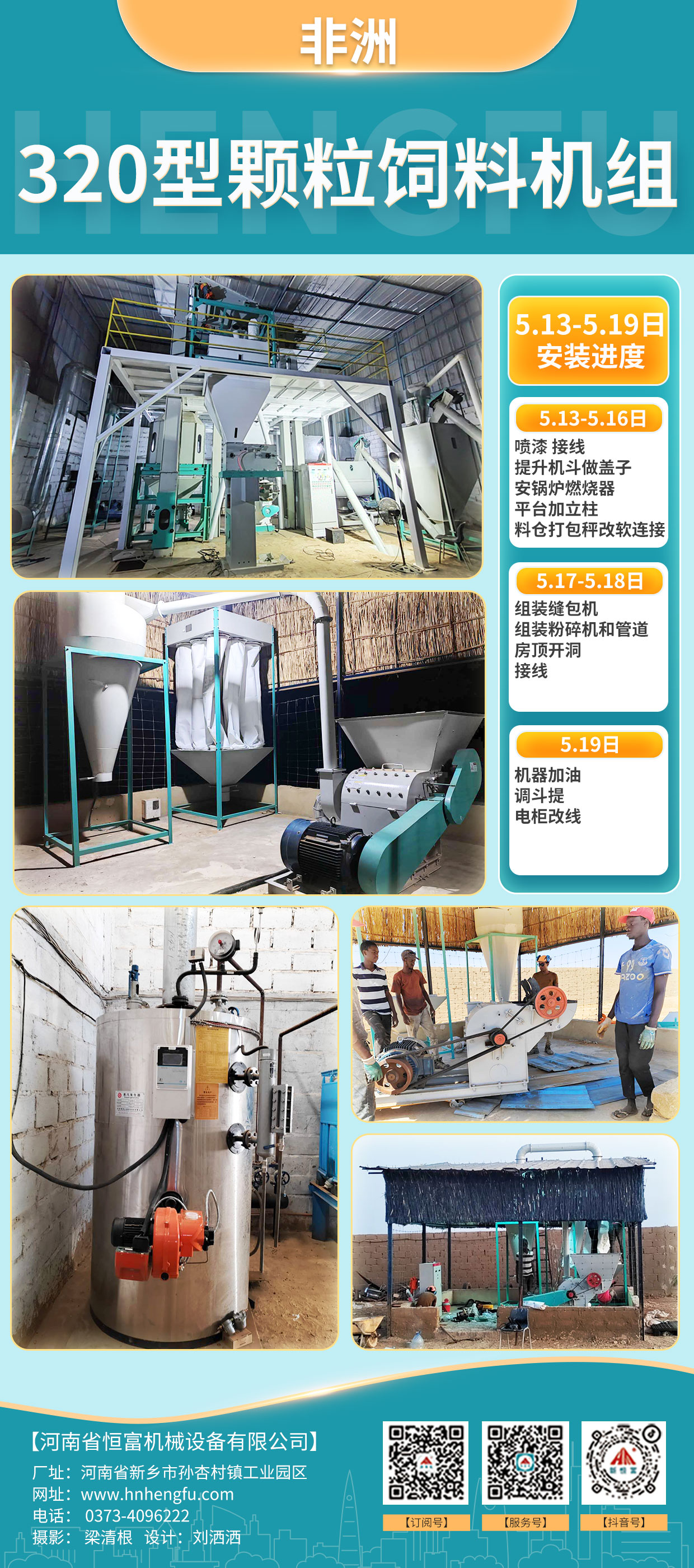 正在安裝的設備:非洲320型顆粒飼料機組、山西臨汾250型草粉顆粒機組(zǔ)。