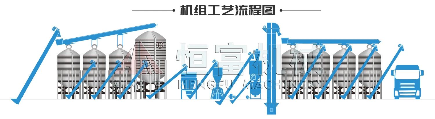 該條生產線包含設備有:烘幹機(客戶自有)、圓筒原料初清篩、2台水滴型飼料粉碎(suì)機(jī)、2台脈衝飼料除(chú)塵器、2個(gè)30m3鍍鋅料(liào)塔、2個2m3待粉(fěn)碎倉、包裝碼垛(duǒ)設備、提升輸送設備以及控製係統等。