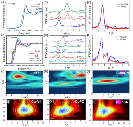 同步輻射結果進一步(bù)表明:雙金屬In和Cu催化劑是原子(zǐ)分散的,其中Cu是+1價,In是+3價。In與4個N原子配位,Cu與接近(jìn)3個N原子相連。沒有發現Cu-Cl的配位環(huán)境(jìng),進一步說明(míng)Cl是與CN載體中的C原子成(chéng)鍵。