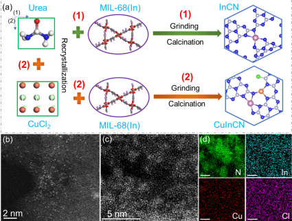 作者以聚合的氮化碳為載體,In-MOF和Cu的氯化物為前驅體,采(cǎi)用(yòng)原位熱解的策略製備了Cl調節的(de)p-d族雙(shuāng)金屬原子(zǐ)分散的催化(huà)劑(CuInCN),並對製備的材料進行一係列結構的表征。研究發現,該催化劑中除了存在孤(gū)立的金屬位點,也(yě)存在一些In-Cu原子對。尤其,EDS能譜分析中發現除了In和(hé)Cu金屬外,存(cún)在少量的Cl元素。XPS進一步確定了材料中存在Cl元素,其與(yǔ)C配位。
