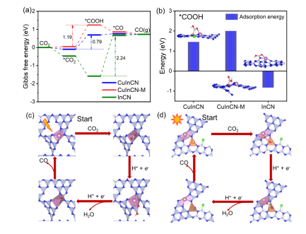 對三個材料進行(háng)反應自由能壘分析(xī),對於CuInCN和CuInCN-M,*COOH的生成是(shì)速度控製步驟;對於InCN來說,*COOH的解離是(shì)速控製步驟。其中CuInCN表(biǎo)現出最低的反應活化能。反應能(néng)壘的差異與材料對*COOH中間體的吸附能息息相關。由於CuInCN獨特的電子結構,使其對*COOH中間體的吸附能力適中,導致In和Cu位點協同參(cān)與*COOH的吸附,進而降低*COOH的生成(chéng)能壘,從而促進CO的生成(chéng)。