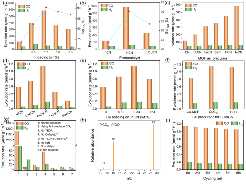 作者將製備的原子(zǐ)分散的雙金屬催化劑應用於光催(cuī)化CO2還原(yuán)反應中。在TEOA與[Co(bpy)3]2+存在的體係中,CO為主要產(chǎn)物(wù)。對比其他金屬MOF作為前驅體,製備的金屬(shǔ)/CN,單原子InCN顯示(shì)了(le)最好的CO生成性能。在其基礎上引入一係(xì)列d族金屬,如Fe、Co、Ni、Cu等,其中In-Cu發揮出(chū)最優的性能。調(diào)控引入Cu的前驅體種類(lèi),發現Cu的氯化物(無論是CuCl還是CuCl2)性能高於Cu-MOF為前驅體(tǐ)的In-Cu催化劑。最優的CO生成速率為1.2 mmol g-1 h-1,是In單原子催化活性的5倍,單純的氮化碳的10倍。對照試驗以及同位素實(shí)驗結果表明CO是來源於CO2轉化。