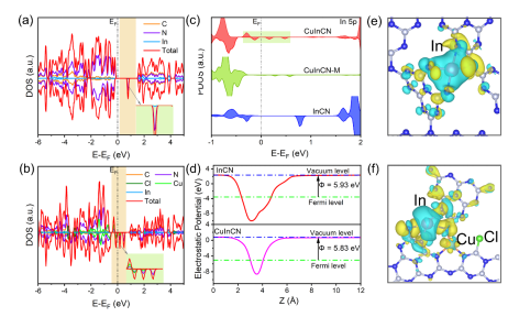 DFT計算模擬(nǐ)構建了三個結(jié)構模型,InCN,CuInCN-M(沒有Cl),CuInCN(帶Cl)。態密度結合差分電荷密度(dù)研究發現:單純(chún)引(yǐn)入Cu原(yuán)子到(dào)InCN中(即CuInCN-M),明顯增加了活性位點,提高了電子傳導性(xìng)。Cl原子的進(jìn)一步存在,提高了價電子的遷移率。尤(yóu)其調(diào)控了In的能帶結構,使得In位點變(biàn)得(dé)更活(huó)潑。同時,Cl原(yuán)子調控了In位點(diǎn)的電子雲密度,使其電負性適中(zhōng)(強於CuIn-M,弱於InCN)。