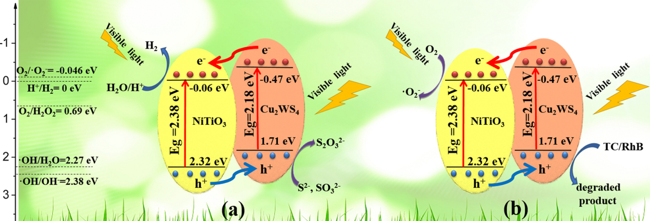 根據以上分析(xī)和討論,我們提(tí)出了Cu2WS4/NiTiO3複合材料的可見光光催化(huà)產氫和降解TC/RhB機(jī)理(圖7)。圖7a說明了光催化析氫的機理,在可見光照射下(λ > 420 nm),Cu2WS4和NiTiO3均被光激發產生電子(zǐ)-空穴對。基於能帶結構理(lǐ)論,Cu2WS4的CB上光生電子可以快速轉移到NiTiO3的CB上,並與H2O/H+結合生成H2。同時,NiTiO3的VB中的光生空穴轉(zhuǎn)移到Cu2WS4的VB中,將(jiāng)S2-/SO32-氧化(huà)為S2O32-物種。此外(wài),圖7b顯示了TC/RhB的降解機理。Cu2WS4的CB上的光生電子傳遞到NiTiO3的CB上,進一(yī)步將O2還原為·O2-。這是因為NiTiO3的CB電位(-0.06 eV)比O2/·O2-電位(-0.046 eV vs NHE)更負(fù)。同時,與·OH/H2O(2.27 eV)和·OH/OH-(2.32 eV)的標(biāo)準還原電位相比,Cu2WS4的VB電位(wèi)(1.71 eV)還不夠正,表明Cu2WS4中積累的空穴不能氧化H2O/OH-生成·OH。因此,TC/RhB的光降解主要歸因於空穴和·O2-自(zì)由基的作用。