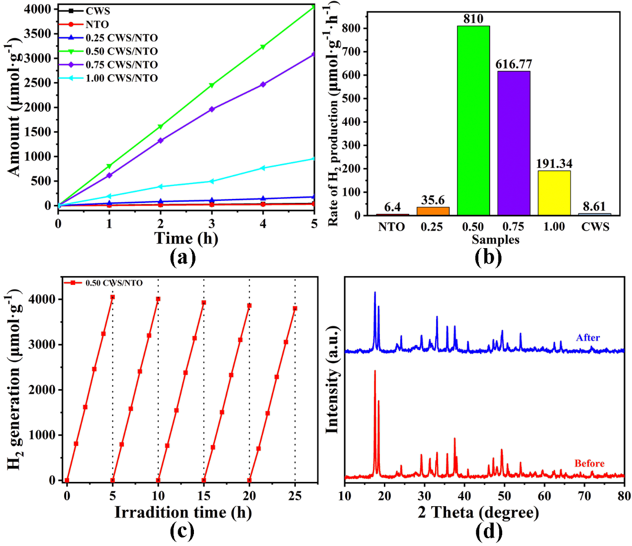 2、通過調控(kòng)Cu2WS4的(de)含量,0.50 Cu2WS4/NiTiO3具有最佳的催化活性,產氫量為810 μmol·g-1·h−1,420 nm處的AQE 為1.65 %。