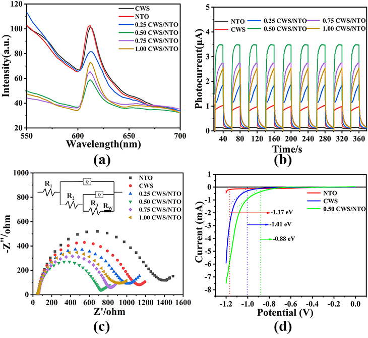 如圖5a所示,作者通過(guò)熒光發射光譜(PL)研究了所製備樣品中(zhōng)光生載流(liú)子的分(fèn)離情況。可(kě)以明顯觀察到,所有製備的材料在(zài)610 nm附(fù)近都有相似的峰(fēng),Cu2WS4/NiTiO3材料的熒光強(qiáng)度(dù)比Cu2WS4和NiTiO3樣品的熒(yíng)光強度(dù)低,說明Cu2WS4和NiTiO3的(de)耦合極大程度阻礙了光生載流子的複合。值得注意的是,0.50 Cu2WS4/NiTiO3樣品的峰強(qiáng)度最低,說明其具有最強的光生電子-空穴對的分離能力,利於其催化性能的提高。作者係統地測試了不同樣品的(de)光電流響應(i-t)和電化學交流阻抗(kàng)譜(EIS),來進(jìn)一步證明光生e-和h+的分離和遷移能力。上述數(shù)據(jù)表明,通過Cu2WS4與(yǔ)NiTiO3的耦合,能顯著提高光生載流子的分離效率,有利於催(cuī)化劑性能的提高。作者采用(yòng)線性掃描伏安法(LSV)研究了不同材料在光(guāng)照射下的光催化析(xī)氫起始電位。如圖5d所示,這(zhè)些數(shù)據證明,由於H+被快(kuài)速還原(yuán)為H2,所製備的(de)催化劑可以降低析氫的過電(diàn)位。總體而言,PL、i-t、EIS、LSV的研究結果(guǒ)驗證了Cu2WS4和NiTiO3的結合(hé)提高了光(guāng)生載流子的分離和轉移效率(lǜ)。