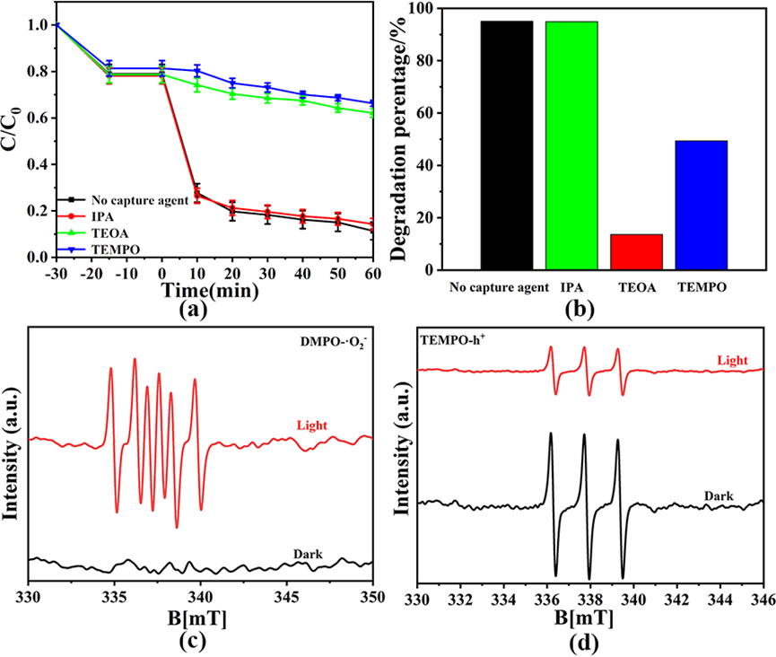 通過自由基捕獲實驗驗證了光催(cuī)化降解TC的機理。本文采用(yòng)三(sān)乙醇胺(TEOA)、異丙醇(IPA)和4-羥基TEMPO分別作為空(kōng)穴、羥自由基和超(chāo)氧(yǎng)自由基的猝滅劑(jì),驗(yàn)證了降解過程中的主要反應物種(圖6)。如圖6a和圖6b所(suǒ)示,加入IPA對0.50 Cu2WS4/NiTiO3的TC降解率基本不變,說明·OH不是關鍵活性物質。而引入4-羥(qiǎng)基TEMPO/TEOA後,TC的降解(jiě)率明顯下降,說明·O2-和h+主要促進了TC的降解。此外,利用ESR測試進一(yī)步確定光催化過程中生成的活性物種。圖6c所示,黑暗下的·O2-實驗沒有發現峰,而在可見光照射下,這些特征(zhēng)峰明顯分(fèn)布在·O2-/DMPO化合物中,進一步驗證了·O2-的(de)產生。圖6d所示,在黑暗中觀察(chá)到三個強度均勻(1:1:1)的TEMPO峰,這(zhè)些峰(fēng)在可見光照射下明顯(xiǎn)下降,表明TEMPO-h+自旋加合物的形成。上述結果驗證了h+和·O2-在TC降解過程中起著至關重要(yào)的作用。