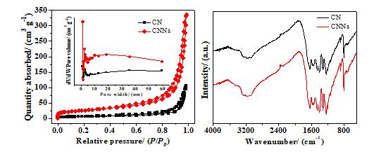 圖2.(a)CN和CNNs樣品的N2吸/脫附曲線(插圖:孔徑分布圖);(b)CN和CNNs樣品的FTIR圖