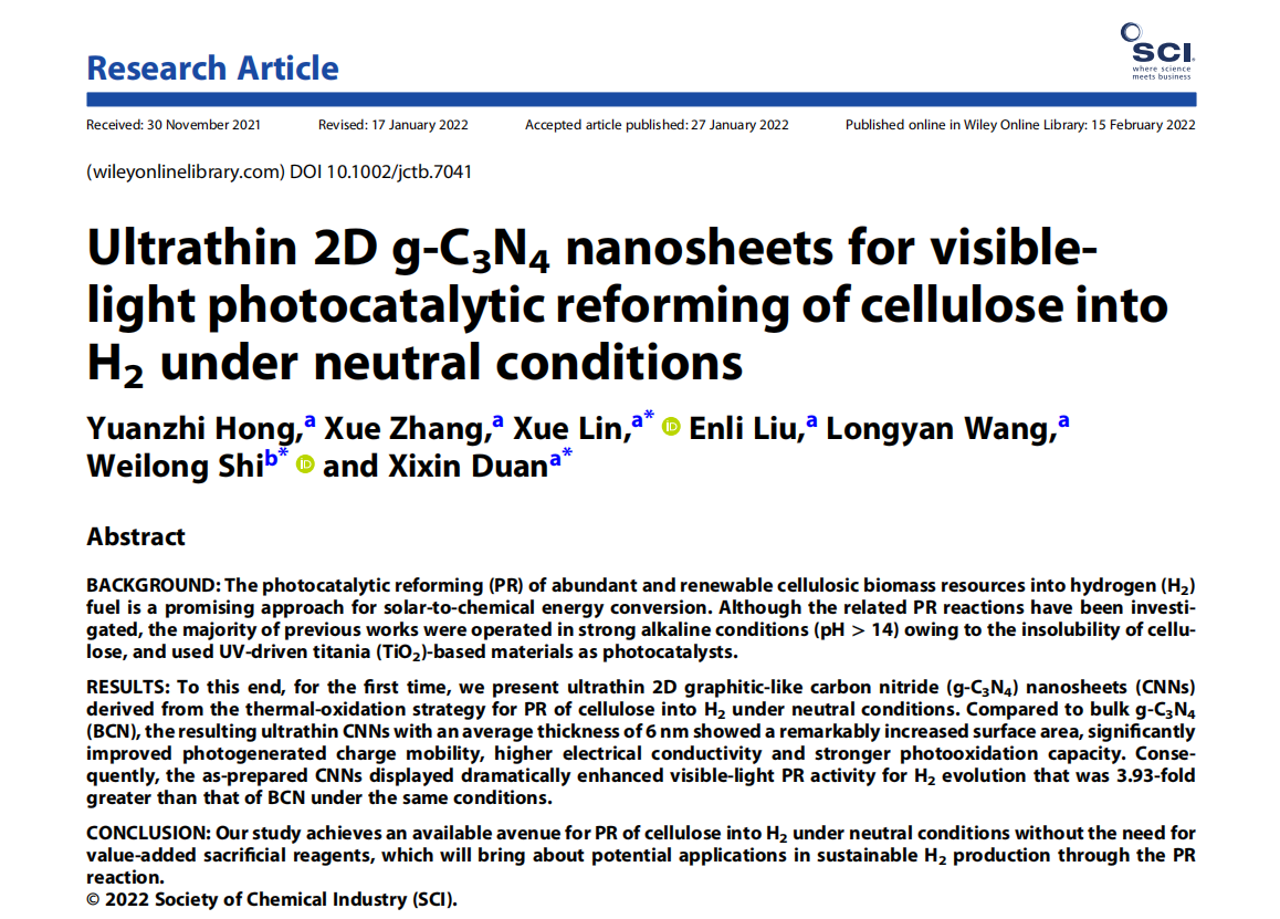 中文標題: 超薄二維(wéi)氮化碳納米(mǐ)片用於在中性、可見光條件(jiàn)下的光催化重整纖維素製氫性能研(yán)究