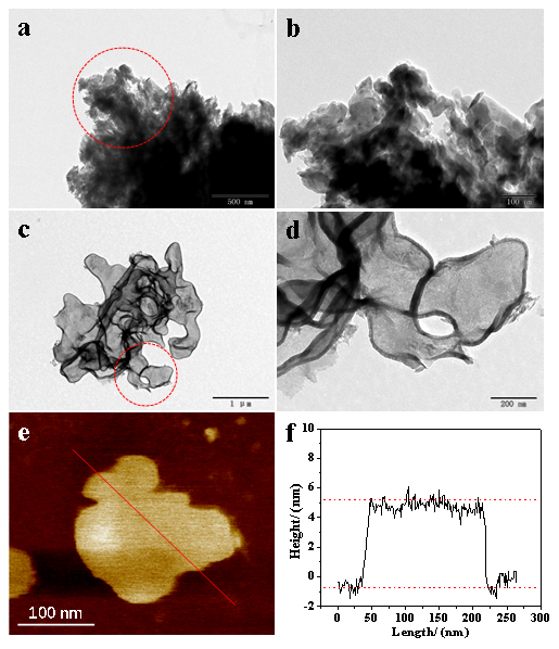 圖1.(a,b)CN(c,d)CNNs樣品的TEM和(hé)(e-f)CNNs樣品的AFM圖