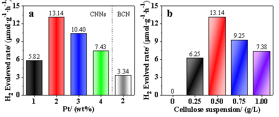 圖4.(a)CNNs樣品在不同Pt負(fù)載(zǎi)量條件(jiàn)下光(guāng)催化重整纖維素製氫的平均速率;(b)CNNs樣品在在不同纖(xiān)維(wéi)素(sù)濃度條件下光催化重整纖維(wéi)素製氫的平均(jun1)速率