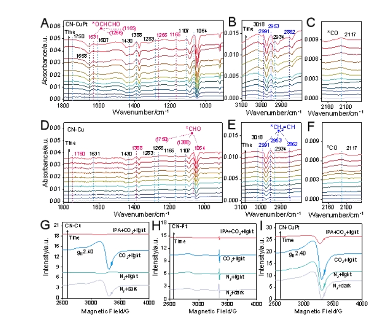 圖 2, 光(guāng)催化 CO₂ 還(hái)原(yuán)耦合 IPA 氧化(huà)的 C₂H₄ 生成機理研究。(A) 可見光(guāng)照射下,CN-CuPt 在 1800-900 cm⁻¹ 波段的原位 ATR-FTIR 譜(pǔ)圖,光譜每 5 分鍾采集一(yī)次。(B) 3100-2800 cm⁻¹ 波段。(C) 2180-2050 cm⁻¹ 波段的 ATR-FTIR 譜圖。(D-F) CN-Cu 在相同波段的原位 ATR-FTIR 譜圖。(G-I) CN-Cu、CN-Pt 和 CN-CuPt 催化劑(jì)的原位電(diàn)子順磁共振(EPR)光譜,分別(bié)在黑暗和不(bú)同光照條件下(約 100 K)采集數據。