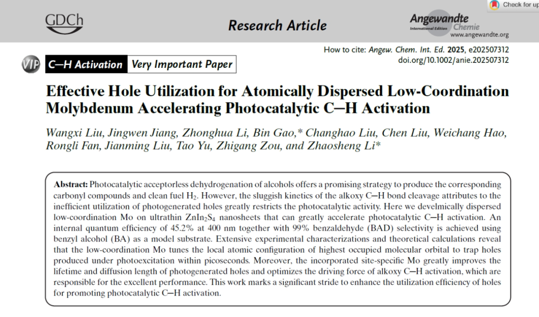 光催化醇無(wú)受體脫氫反應為製備羰(tāng)基化合物和清潔燃料(liào)氫氣提供了可行策略。然而,烷氧基C–H鍵斷裂的緩慢動力學導致光生(shēng)空穴利用率低下,嚴重製約了催(cuī)化(huà)活性。本研究在超(chāo)薄ZnIn2S4納米片上構(gòu)建原子級分散的低配(pèi)位鉬活性位點,可大幅加速光催化(huà)C–H鍵活化。以苯甲醇為模型底物時,在400 nm波長下實現45.2%的內量子效率,苯甲醛(quán)選擇(zé)性高(gāo)達99%。係統的實驗表征(zhēng)與理論計(jì)算表明:低配位鉬(mù)通過調控最高占據分子軌道的局域(yù)原子構型,可在(zài)皮秒級時間內捕獲光(guāng)激發產生的空穴;同(tóng)時,該特異性鉬位點顯著延長了光生(shēng)空穴壽命及擴散距離,並優(yōu)化(huà)了烷氧基C–H鍵活化的驅動力,從而獲(huò)得卓越的催化性能(néng)。該工作為提升空穴利用效率以(yǐ)促進光催(cuī)化C–H鍵活化(huà)做出了重要突破。
