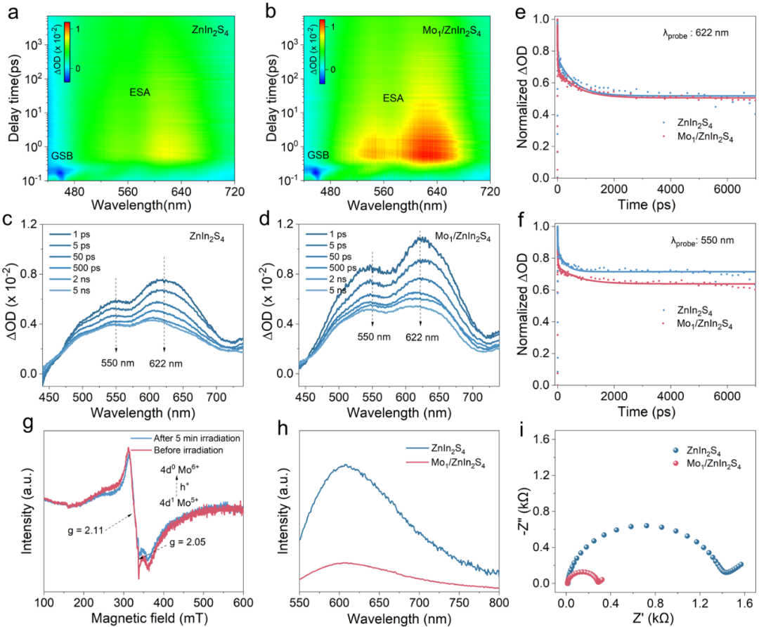 隨後(hòu),作者進行飛秒瞬態光譜測試,以深入理解光催化(huà)過程中的載流子動力學。ZnIn2S4和Mo1/ZnIn2S4在400 nm激發下,在550和622 nm處(chù)產生激發態吸收,分別歸因於捕獲態空(kōng)穴和電子的信號(圖4a-d)。對550和(hé)622 nm處的(de)信號進行擬合,結果表明Mo單原子分別提升空穴和電子的壽(shòu)命1.2和2.6倍(圖4e,f)。進一步,原位輻照EPR圖譜顯示,Mo1/ZnIn2S4在光照下Mo5+的信號強度減少(圖4g),表明Mo位點捕獲光生空穴。PL光譜(圖4h)與阻抗圖(圖4i)表明Mo單原子有效抑製載(zǎi)流子複合和促(cù)進電子轉移。