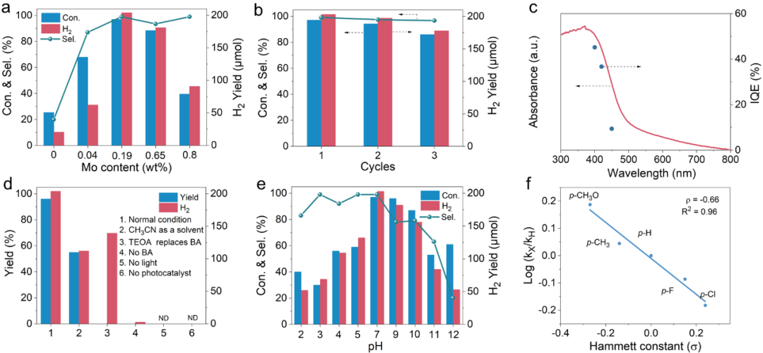 隨後,作者進行苯甲醇脫氫苯甲醇(chún)無受體脫氫反應性能測試(圖2a)。在ZnIn2S4上,主要生成的(de)是C–C偶聯產物氫化安息香,對苯甲(jiǎ)醛的選擇性為20%,而且轉化率隻(zhī)有25%。在摻(chān)入0.19 wt% Mo單原子後,光催化性(xìng)能明顯得到提升,轉化率提高到97%,而(ér)且對(duì)苯甲醛的選擇性提高到99%。反應在三個循環後,性能沒(méi)有出(chū)現明顯(xiǎn)降低(圖2b)。Mo1/ZnIn2S4在400 nm處的內量子效率達到(dào)45.2%,表明催(cuī)化劑(jì)對光生(shēng)載流子能夠有效利用(圖2c)。作者還探究了溶劑(jì)、光照、pH、取代基(jī)等對(duì)反應的影響(圖2d-f)。