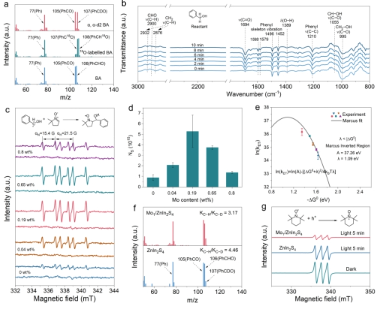 作者用α,α-d2 苯甲醇(chún)和18O標記苯(běn)甲醇進行(háng)質譜(pǔ)實驗,證(zhèng)明溶劑中的H2O分子沒有參與反應(圖3a)。通過原位紅外實驗觀察到*PhCHOH中間物種的C–O伸縮振(zhèn)動峰(圖3b),表明苯甲醇是先斷裂C–H,再斷裂O–H鍵。作者用DMPO作為自由基捕獲劑,在(zài)不同Mo含量的Mo1/ZnIn2S4樣品中均觀(guān)察到DMPO–PhCHOH加合物的信(xìn)號(圖3c)。對信號進行二次積分計算(suàn)出自旋數(Ns)(圖3d),即為DMPO–PhCHOH的生成量。因為(wéi)C–H鍵需要轉移一個電子到催化劑上(shàng)才能形(xíng)成一個DMPO–PhCHOH分(fèn)子,因此獲得的Ns等價於C–H鍵的電子轉移數,進而(ér)計算出(chū)C–H鍵電子轉移速率(lǜ)。作者通過同步(bù)輻射價帶譜確定不同Mo含(hán)量的Mo1/ZnIn2S4對苯甲醇氧化的空穴驅動力,並將驅動力與C–H鍵電子轉(zhuǎn)移速率代入到Marcus等式中(圖3e),發現C–H鍵活化位於Marcus反轉區(qū),即驅動力減少,電子轉移速率增大。作者用等量的苯甲(jiǎ)醇和α,α-d2 苯甲醇(chún)作為反應物進行動力學(xué)同位素效應(KIE)測試(圖3f),發現在Mo1/ZnIn2S4上KIE從4.46減小到3.17(圖3f),說明Mo單原子有利於C–H的活化。用TEMP作為空穴的探針分子,EPR結果(guǒ)表明Mo1/ZnIn2S4能夠產(chǎn)生更多的光生空穴(圖3g)。