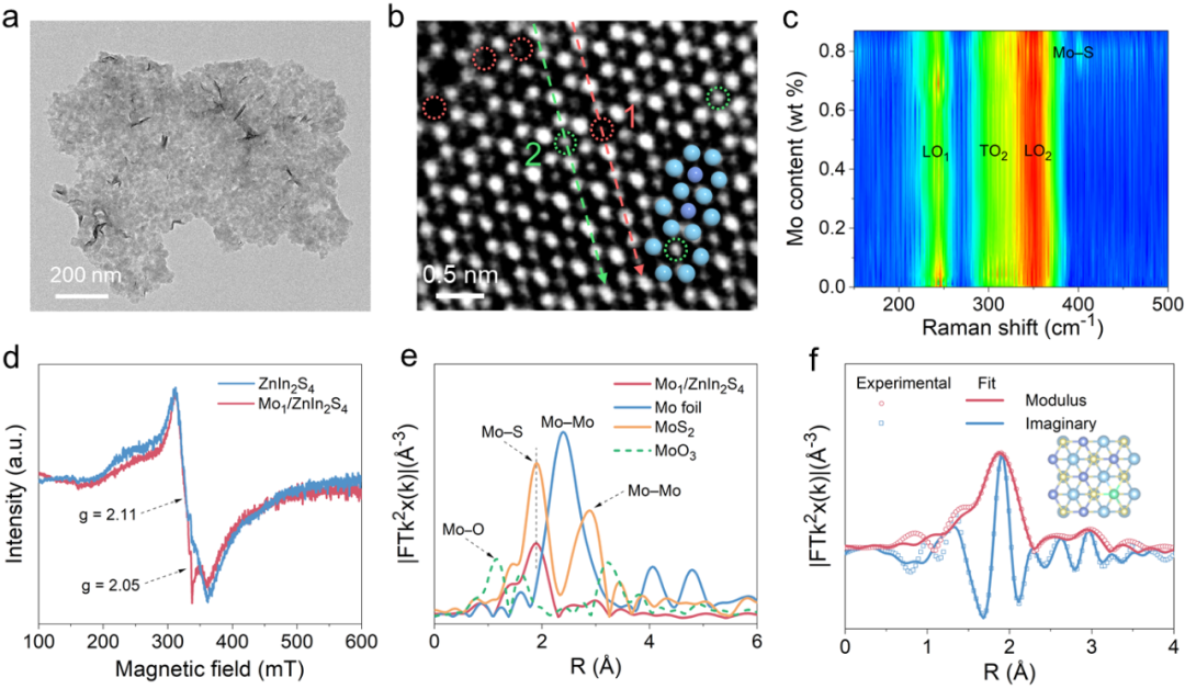 研究內容(róng):作者通過Zn空位(wèi)錨定的方式將低配位Mo單原子分散在超薄的ZnIn2S4納(nà)米片上(圖(tú)1a,b)。在摻入Mo單原子後,在(zài)401 cm−1處出現Mo–S鍵的(de)拉曼(màn)峰(圖1c),沒有出現MoS2、MoO2和MoO3的(de)信號,表明沒有引入新相。在低溫(wēn)EPR圖譜中觀察(chá)到,Mo1/ZnIn2S4在g = 2.05處出現Mo5+的信號,表明Mo的(de)價態(tài)為+5價(jià)。EXAFS結果顯示,在Mo1/ZnIn2S4樣品(pǐn)中未檢測到明顯的Mo–Mo鍵信號,證實Mo位點(diǎn)以原子級(jí)分散形式存在。並且,EXAFS擬合結果顯示Mo–S鍵的配位數為4,說明Mo具有低配位的特性。