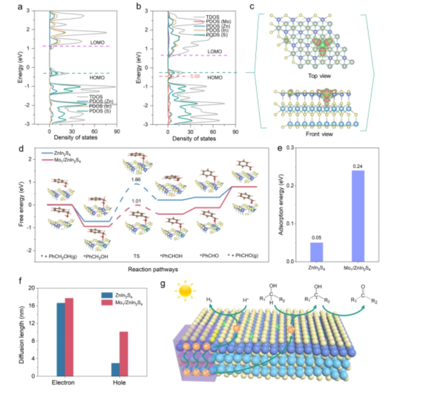 作者通過分子軌道分析,進一步探究(jiū)了Mo單原子對電(diàn)子結(jié)構的影響。ZnIn2S4和(hé)Mo1/ZnIn2S4的(de)PDOS分析表明(圖5a和5b),Mo在HOMO引入新的分子軌道,表明Mo參與ZnIn2S4價帶頂(dǐng)的構型,從而能(néng)夠對空穴的驅動力進行調控(kòng)。Bader電(diàn)荷(hé)計算顯示(圖(tú)5c),更多的電子集中在(zài)S原子上,這表明Mo位點傾向於富集空穴,從而(ér)驅動醇的無受(shòu)體脫(tuō)氫反應(yīng)。吉布斯自由能計算結果表明原子級分散的Mo活性位點(diǎn)具有雙重作用:不(bú)僅能顯著(zhe)降低C–H鍵斷裂的能壘,還可穩定(dìng)*PhCHOH中間體以促進後續(xù)O–H鍵斷裂的過程。根據(jù)霍爾效應測試和有效質量計算結果,作者得到(dào)ZnIn2S4和Mo1/ZnIn2S4的載流子擴散長度(圖(tú)5f),發現Mo1/ZnIn2S4的空穴擴散長度提升了3.4倍,這(zhè)確(què)保(bǎo)了(le)光生空穴能夠有效遷移至Mo活性位點。