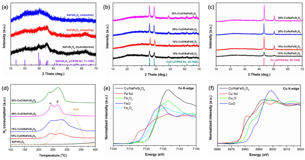 通(tōng)過XRD可以看出經過水熱、煆(duàn)燒以及還原處理,能夠成功製備Cu/NaFeSi2O6催化劑(圖2),H2-TPR進一步證實CuO負(fù)載的NaFeSi2O6催化(huà)劑由於金(jīn)屬/載體界麵作用,有利於CuO的分解還原(yuán)(相比純CuO,CuO/NaFeSi2O6還原溫度降低)。同步(bù)輻射結果顯示,Cu/NaFeSi2O6催化劑(jì)中的Fe物種譜線與(yǔ)Fe2O3參比相似,表明Fe是(shì)以+3價存在(zài);但是,兩者散射峰仍存在差(chà)異,說明Fe3+在(zài)NaFeSi2O6和Fe2O3中的配位環境不同。同樣,同步(bù)輻(fú)射(shè)和(hé)XPS結(jié)果表明Cu是以金屬態形式存在的。