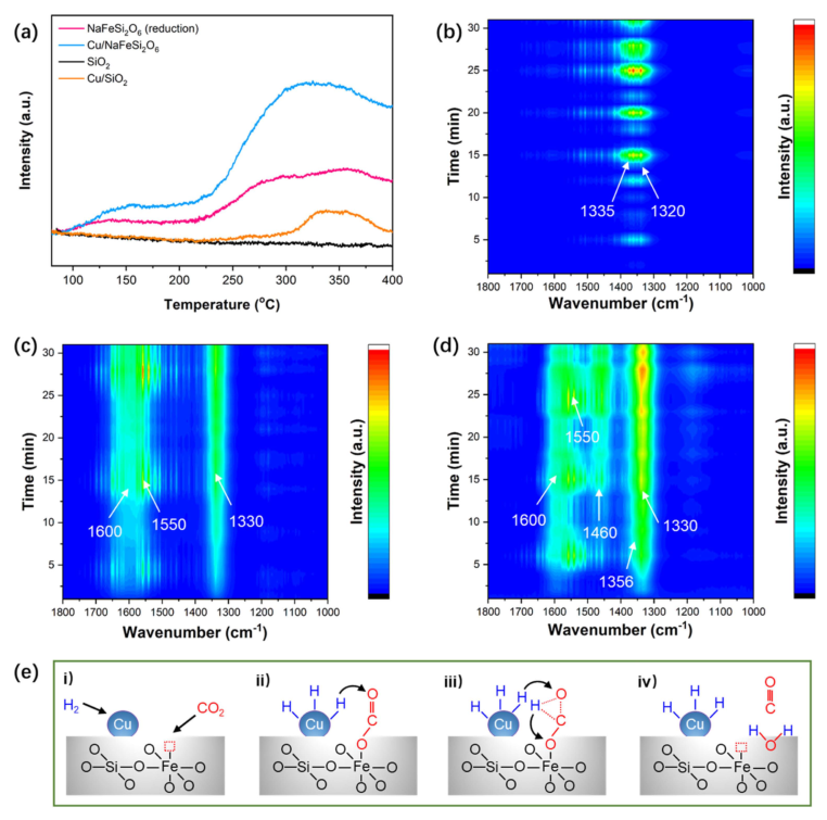 除了電子能帶結構,Cu/NaFeSi2O6催化劑優異的光催化性(xìng)能也受其表麵活性位點的影(yǐng)響(xiǎng)(圖6)。ESR光(guāng)譜表明直接水熱合成的(de)NaFeSi2O6沒有氧空位信號(hào),而H2還原後以及(jí)Cu負載的(de)催化劑均具有氧空位信號,與O 1s XPS結果一致。NaFeSi2O6是由SiO4四麵體和FeO6八麵體(tǐ)構成。相對而(ér)言,Si-O鍵的(de)化學(xué)鍵能要強(qiáng)於Fe-O鍵,因此,在H2還原(yuán)過程中(zhōng),與Fe相連的O原子更容易被移除,從而使得Fe原子配(pèi)位不飽和,表現出路易斯(sī)酸位點特征。由於(yú)金屬-氧化物(wù)的界麵效應,金屬Cu負載能夠進(jìn)一(yī)步增強催化性能。NH3-TPD結(jié)果可以看出,相比SiO2,NaFeSi2O6及Cu/NaFeSi2O6均表現出強的路易斯酸(suān)性特征。氧化物催化(huà)劑中的路易斯酸位點通常(cháng)被認為是(shì)活化CO2的關鍵位點。從CO2-TPD譜圖可以看出(圖7),Cu/NaFeSi2O6具有(yǒu)最強的CO2脫附(fù)信號。原位紅外光譜也能進一(yī)步說明不同催化劑對CO2的活(huó)化過程,其中(zhōng),Cu/NaFeSi2O6催化劑的原位光譜圖中(zhōng)可以看到甲酸根等關鍵中間物種。此外,Cu金屬顆粒對H2的(de)解離(lí)以及氫溢出也能進(jìn)一(yī)步促(cù)進CO2-CO的轉化。