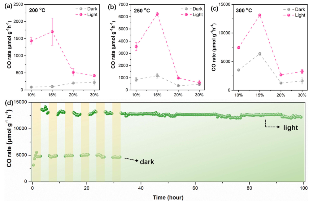 在流動相微反裝置測試了催化劑的光催化(huà)CO2加氫性能(圖3)。在200,250以及300 °C反應溫度下,Cu/NaFeSi2O6催(cuī)化劑表現出逐漸增(zēng)強的CO生成速率,且光響應顯著。同等反應條件下,Cu/NaFeSi2O6催(cuī)化劑的催化活性顯著優於單一催化劑(jì)、物理(lǐ)混合催化劑以及Cu/SiO2對比催(cuī)化劑。在300 °C 加光條件下,Cu/NaFeSi2O6催化劑的CO生成速率達到最大值(zhí),優於大多數當前報道的催化劑。進一步,我們考察了(le)不同(tóng)Cu負載量的影(yǐng)響,發(fā)現(xiàn)15%Cu負(fù)載效果最佳,這可能是由於該負載濃度能(néng)夠(gòu)得到具有最佳Cu顆粒大小和分散度的催化(huà)劑。該催化劑在反複光照開/關以及(jí)長時間活性(xìng)測試條件下保持良好催化活性,顯示出優異的活性穩定性(圖4)。