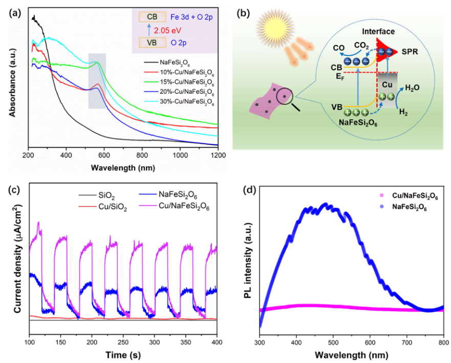 為了探(tàn)究Cu/NaFeSi2O6催化劑光催化CO2加氫(qīng)性能優異的原因,對其光學和電荷分離性質(zhì)進行了表(biǎo)征。從圖5可以看出,由於過渡金屬(shǔ)Fe 3d軌道的貢獻,NaFeSi2O6顯(xiǎn)示出良好的可見光吸收性能。金屬Cu納米顆粒的負載進一步(bù)增強了催化劑(jì)的光吸收特性(xìng),且表現出金屬等離(lí)子體共振效應。利用UPS和原位XPS測試,進一步證明在光照時Cu的(de)熱電子能夠注入NaFeSi2O6並用於CO2還原。光電化學表(biǎo)征和熒光(guāng)光譜說明Cu/NaFeSi2O6具有良(liáng)好的載流子(zǐ)分離和遷移性能。