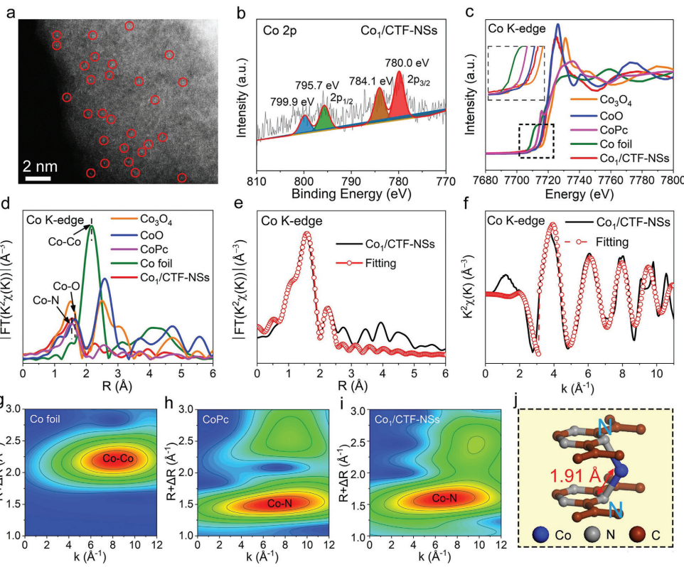 圖2 通過(guò)AC-HAADF-STEM,XPS光譜展示了Co單原子在Co1/CTF-NSs中的分散和化學狀態,XAFS分析揭示了Co原子(zǐ)的確切(qiē)原子結構和配(pèi)位環(huán)境。