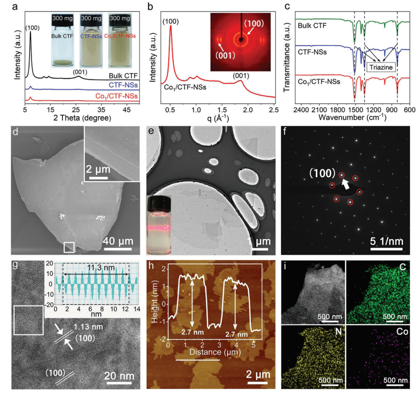 圖1 利用PXRD, 2D WAXS和FT-IR證實了Co1/CTF-NSs的晶體結構和化學組成。利用SEM, TEM, SAED, HRTEM和AFM證實(shí)了Co1/CTF-NSs的(de)形(xíng)貌。