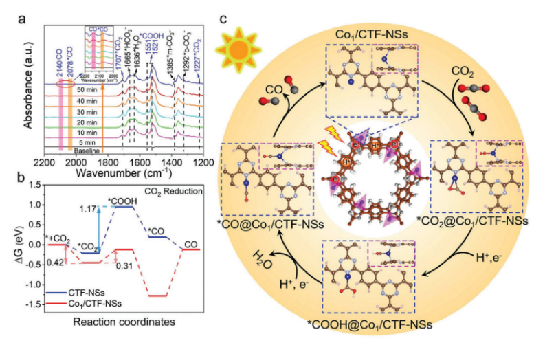 圖6 利用原位漫反射紅外光(guāng)譜(DRIFT)監測(cè)了光催化CO2還原過程中的反應中間體,提出了Co1/CTF-NSs上CO2光(guāng)還原的可能機製