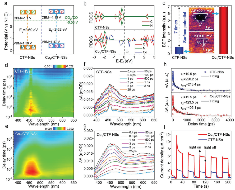 圖4 Co1/CTF-NSs的能帶結構、PDOS圖、表麵電勢圖像、fs-TA光譜和光電流曲線,這些結果表明了突(tū)出的(de)Co極化(huà)場加速了電荷分離和轉移速率。