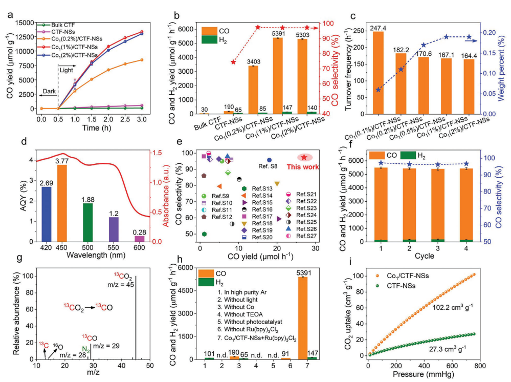 圖(tú)3 不(bú)同樣品在可(kě)見光照射(shè)下(xià)的光催化CO2還原性能,包括CO和(hé)H2的產率、選擇性、AQY和TOF,以及Co1/CTF-NSs的循環穩定性測試和同位(wèi)素標記實驗結果。