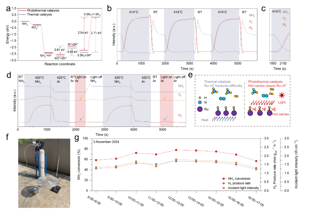 理論計算表明,光熱催化將NH₃分解的表觀活化(huà)能從熱催化的2.71 eV降至2.54 eV(圖4a)。