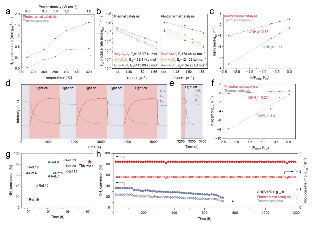 光熱催化與熱催化對比:在相同表麵溫度下,Ru/γ-Al₂O₃在光熱(rè)條件下的氨轉化率(84.8%)顯著高於熱(rè)催化(36.5%),且(qiě)H₂產率達(dá)到1.7 mol·g⁻¹·h⁻¹(圖2a)。