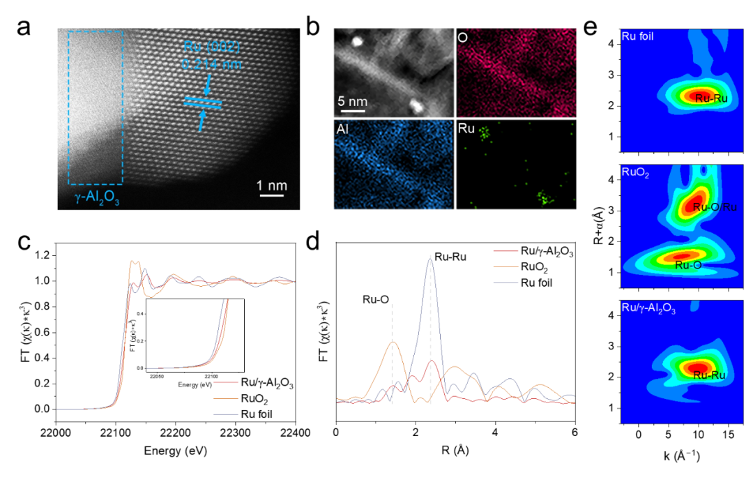 研究團隊(duì)采用浸漬(zì)法製(zhì)備了三(sān)種(zhǒng)金屬(Ni、Au、Ru)負載的(de)γ-Al₂O₃催化劑(M/γ-Al₂O₃),並通過X射線衍射(XRD)、透射電子顯微鏡(jìng)(TEM)、X射線(xiàn)光電(diàn)子能譜(XPS)和原位紅外光譜(pǔ)(DRIFTS)等手段對催化劑進行了係統表征(zhēng)。結果(guǒ)表明,Ru/γ-Al₂O₃催化劑中的Ru納米顆粒以(yǐ)金(jīn)屬態(Ru⁰)和部分氧化態(Ru⁴⁺)共存,且與載體γ-Al₂O₃形成強相互作用,有效抑製了(le)顆粒團(tuán)聚(圖1a-e)。
