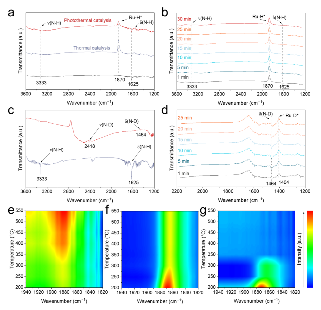 同位素(sù)標記實驗:使用ND₃替代NH₃,證實了Ru-H*鍵的斷裂是(shì)反應的關鍵步驟(圖3c-d)。核心發現與機理分析熱載流子促進Ru-H*鍵斷裂:原位DRIFTS顯示,光照下Ru/γ-Al₂O₃表麵的(de)Ru-H*鍵(1870 cm⁻¹)強度顯著降低(圖(tú)3b)。