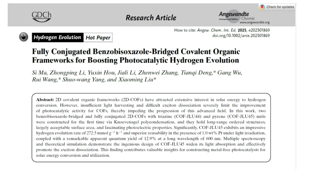 1. 文章信息標題: Fully Conjugated Benzobisoxazole-Bridged Covalent Organic Frameworks for Boosting Photocatalytic Hydrogen Evolution