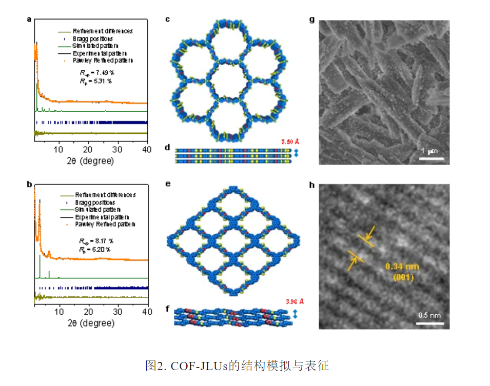 研究團隊采用梯度升溫策略,通過Knoevenagel縮聚反應,以(yǐ)BBX-2CN為連接單元,分別(bié)與三嗪(qín)(TFPT)和芘(TFPPy)單體縮合,成功(gōng)製備了兩種新型COFs。其中(zhōng),COF-JLU44呈現(xiàn)六方(fāng)晶係結構(空間群P6/M),而COF-JLU45為四方晶係(xì)(C2/m空間群)。通過粉末X射線衍(yǎn)射(shè)(PXRD)分析,COF-JLU45的(110)晶麵衍射峰半高(gāo)寬僅為0.34°,顯著優(yōu)於已報道的sp²碳連接COFs,表明其高(gāo)度有序的結晶性。高分辨透射電鏡(HR-TEM)進一(yī)步顯示COF-JLU45具有清晰的0.34 nm晶格條(tiáo)紋,對(duì)應(001)晶麵,證實了層(céng)間π-π堆疊(dié)的有序性。