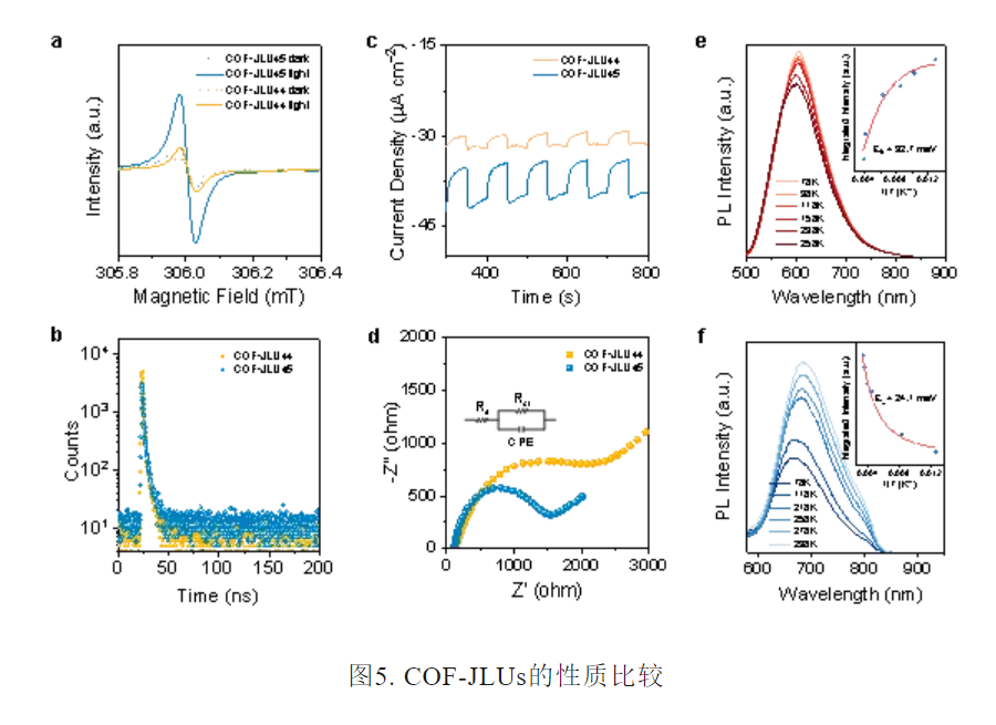 通過時間分辨熒光光譜(TRPL)分析,COF-JLU45的激子平均壽命達2.26 ns,遠超COF-JLU44的1.66 ns,表明其(qí)電荷(hé)複(fù)合速率更低。電化(huà)學阻(zǔ)抗譜(EIS)顯示,COF-JLU45的電荷傳輸阻力小(xiǎo)於COF-JLU44,印(yìn)證(zhèng)了其(qí)更高效的載流(liú)子遷移能力。此外,瞬態光電流測(cè)試顯示,COF-JLU45的陰極光電流密度為6.7 μA cm-2,是COF-JLU44的2.68倍,直觀反映了其優(yōu)異的電荷分離動力學。此外,其激子結合(hé)能低至24.1 meV,接近環境熱能(26 meV),使得激子可自發解離為自由電荷,極大提升了電荷利用(yòng)率