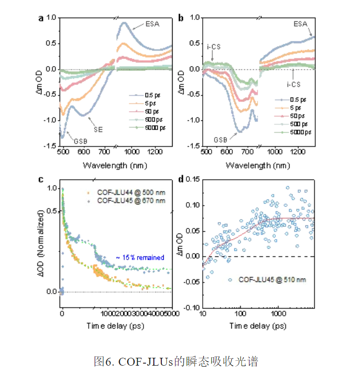 瞬態吸收光譜(TA)分析為揭示(shì)COF-JLU44與COF-JLU45的電荷分離機製提供了關鍵證據(圖6)。在400 nm激光激發(fā)下,COF-JLU44的TA譜圖顯示兩個漂白峰(GSB:~500 nm,SE:~610 nm)及寬範圍的光誘導吸收(PIA:~930 nm),對應(yīng)激子的生成與衰減過程(chéng)。GSB和SE信號在5000 ps內迅速衰減(jiǎn)至基線(圖6a),表明其激子壽命較短(平均1.66 ns),且未(wèi)檢測到電荷分離態(i-CS)的生成。這種快速複(fù)合行(háng)為源於COF-JLU44的三(sān)嗪-苯並雙(shuāng)惡唑結構中電子(zǐ)-空穴重疊積分較高(S=0.74,圖7a),導致激子結合能(Eb=32.7 meV)較大,電荷難以有(yǒu)效解離。