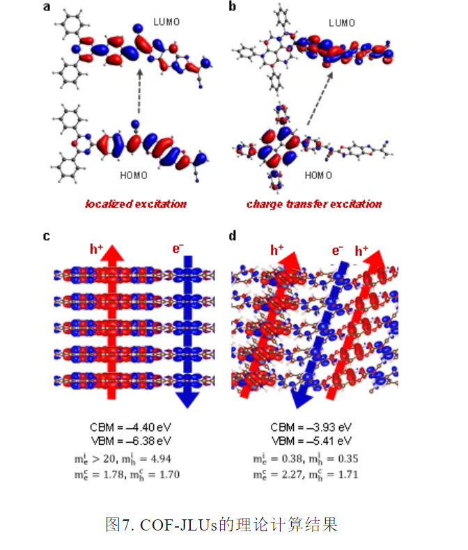 相比之下,COF-JLU45的TA動力(lì)學展現出顯著差異(圖6b-d)。激(jī)發初期(0.5 ps),其GSB信號位於~670 nm,伴隨ESA信號在1350 nm處出現,表明激子(zǐ)的瞬時生(shēng)成。隨著時間延遲,ESA信號逐漸紅移至1150 nm,並在510 nm處形成新的(de)吸收峰(圖6d),這一動態變化揭示了電荷(hé)分離態(i-CS)的逐步形成。值得注意的是(shì),約15%的(de)GSB信號在5000 ps後仍(réng)持續存在(圖6c),表明COF-JLU45中存在長壽(shòu)命的自由電荷載流子,其生成壽命(mìng)經多(duō)指數擬合為105 ps(圖6d)。這種高效的電(diàn)荷分離歸(guī)因於其供體-受體結構:芘單元作為電子供體,苯並雙惡唑-氰基(jī)鏈段作為受體,形成跨(kuà)骨架的電荷轉移態(電子-空穴(xué)分離距離(lí)達9.57 Å,S=0.34),顯著降低了激(jī)子結合能(Eb=24.1 meV)。理論計算進一步表明(圖7b),COF-JLU45的麵(miàn)內(nèi)電子與空穴有效質量分別為0.38 和0.35 ,載流子遷移阻力(lì)極低,使得分離後的電荷可沿共軛骨架快速傳輸至反應(yīng)位點。