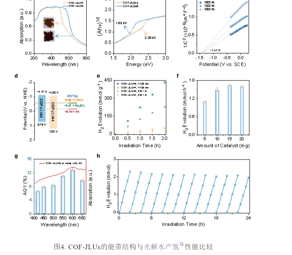 紫外-可(kě)見漫反射光譜(UV-Vis DRS)顯示,COF-JLU45的光吸收邊延伸至680 nm,覆蓋可見光(guāng)至近紅外區域,其光學帶隙(xì)通過Tauc曲線計算為(wéi)1.93 eV,顯著低於COF-JLU44的2.28 eV。這種寬光(guāng)譜響應源於芘單(dān)元的(de)強供電子能力與苯並雙惡唑的(de)吸電(diàn)子效應協同作用,形成供體-受(shòu)體(D-A)結(jié)構,拓寬(kuān)了π共軛體係。通過Mott-Schottky測試計(jì)算導(dǎo)帶電位(CBM)發現,COF-JLU45的CBM為-1.17 V vs. NHE,遠低於質子還原的平衡電(diàn)位(-0.41 V vs. NHE),表明其具備強質子還原(yuán)能力。