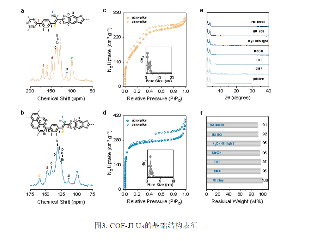 氮氣吸附-脫附測試表明,COF-JLU45的BET比(bǐ)表麵積達860 m2 g⁻1,高於同類材料(如V-COF-2的627 m2 g⁻1),且(qiě)孔徑分布集中(zhōng)於1.9 nm,與理論模(mó)型高度吻合(hé)。固體(tǐ)核磁(13C CP-MAS)與XPS譜圖證(zhèng)實了氰基乙烯鍵的形成,在~159.5 ppm處觀察到新生成的乙(yǐ)烯碳信號。紅外光譜表明醛基特征(zhēng)峰(~2712.8 cm⁻1)顯(xiǎn)著(zhe)減弱,表明單體成功聚合。穩定性測試結果證實(shí)了COF-JLU45具有(yǒu)優異(yì)的酸(suān)堿和光解穩定性。