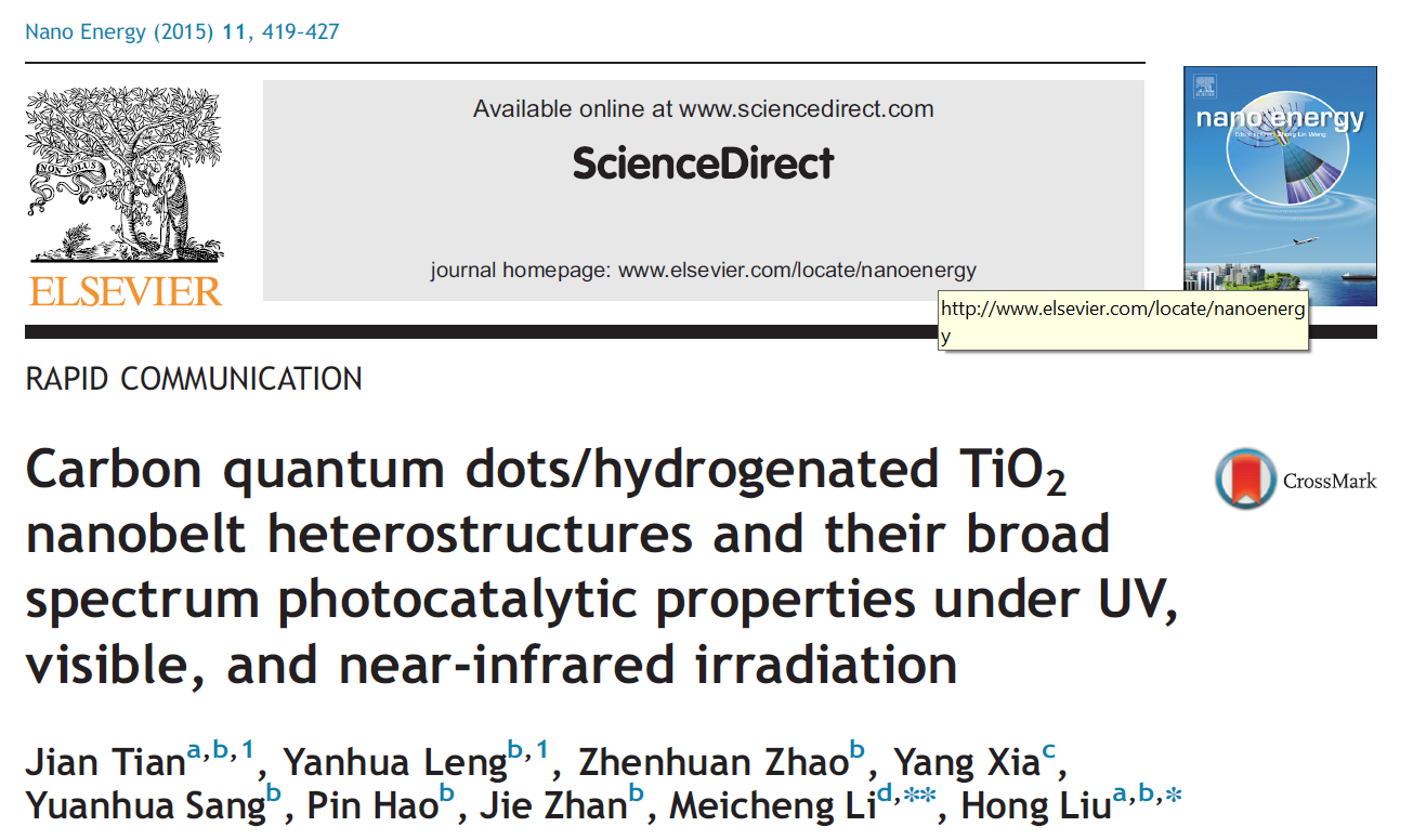 當前位置(zhì) : 首頁 > 資訊動態(tài) > 論文發表 > Carbon quantumdots/hydrogenatedTiO2 nanobelt heterostructuresandtheirbroad spectrum photocatalyticpropertiesunderUV, visible,andnear-infraredirradiati