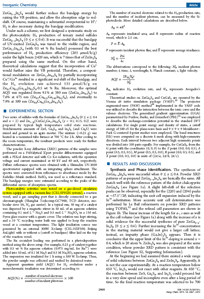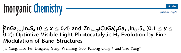 當(dāng)前位置 : 首(shǒu)頁 > 資訊動態(tài) > 論文發表 > ZnGa2−xInxS4 (0 ≤ x ≤ 0.4) and Zn1−2y(CuGa)yGa1.7In0.3S4 (0.1 ≤ y ≤ 0.2): Optimize Visible Light Photocatalytic H2 Evolution by Fine Modul