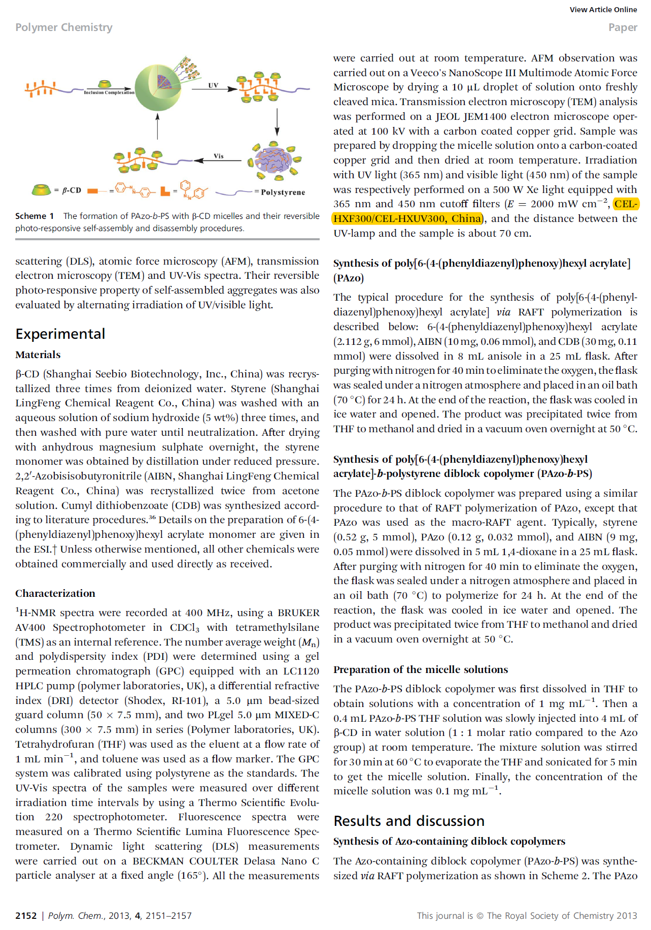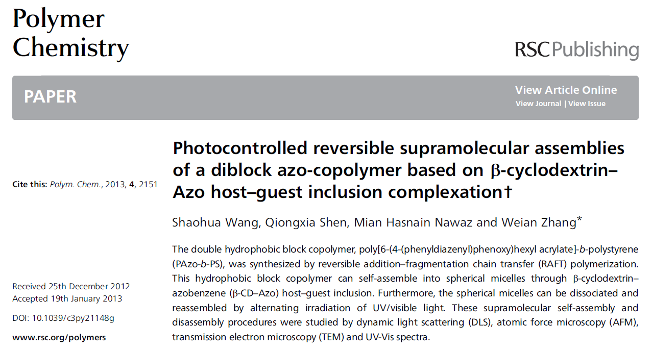 當前位置 : 首頁 > 資訊動態 > 論(lùn)文(wén)發表 > Photocontrolled reversible supramolecular assemblies of a diblock azo-copolymer based on b-cyclodextrin– Azo host–guest inclusion complexation†