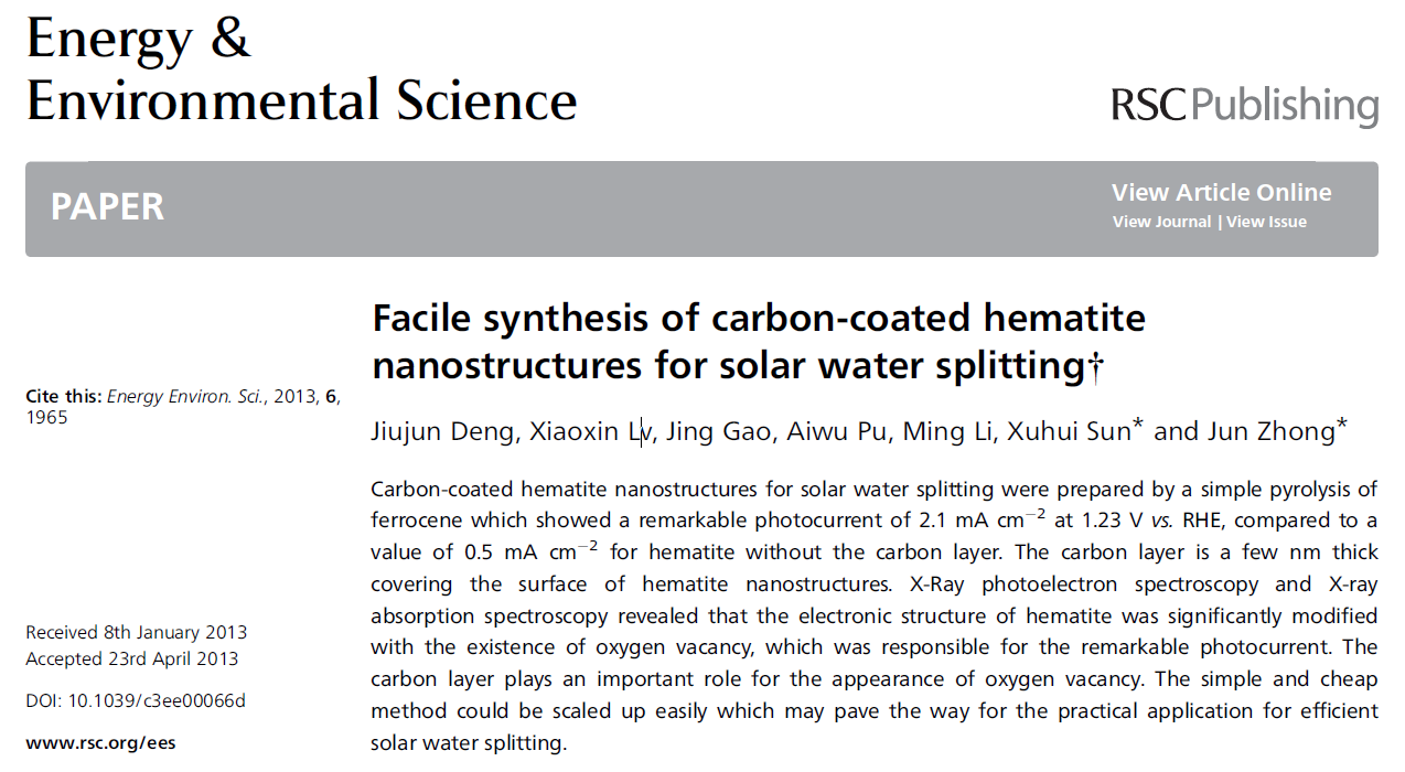 當前位置(zhì) : 首頁 > 資訊動態 > 論文發表 > Facile synthesis of carbon-coated hematite nanostructures for solar water splitting†