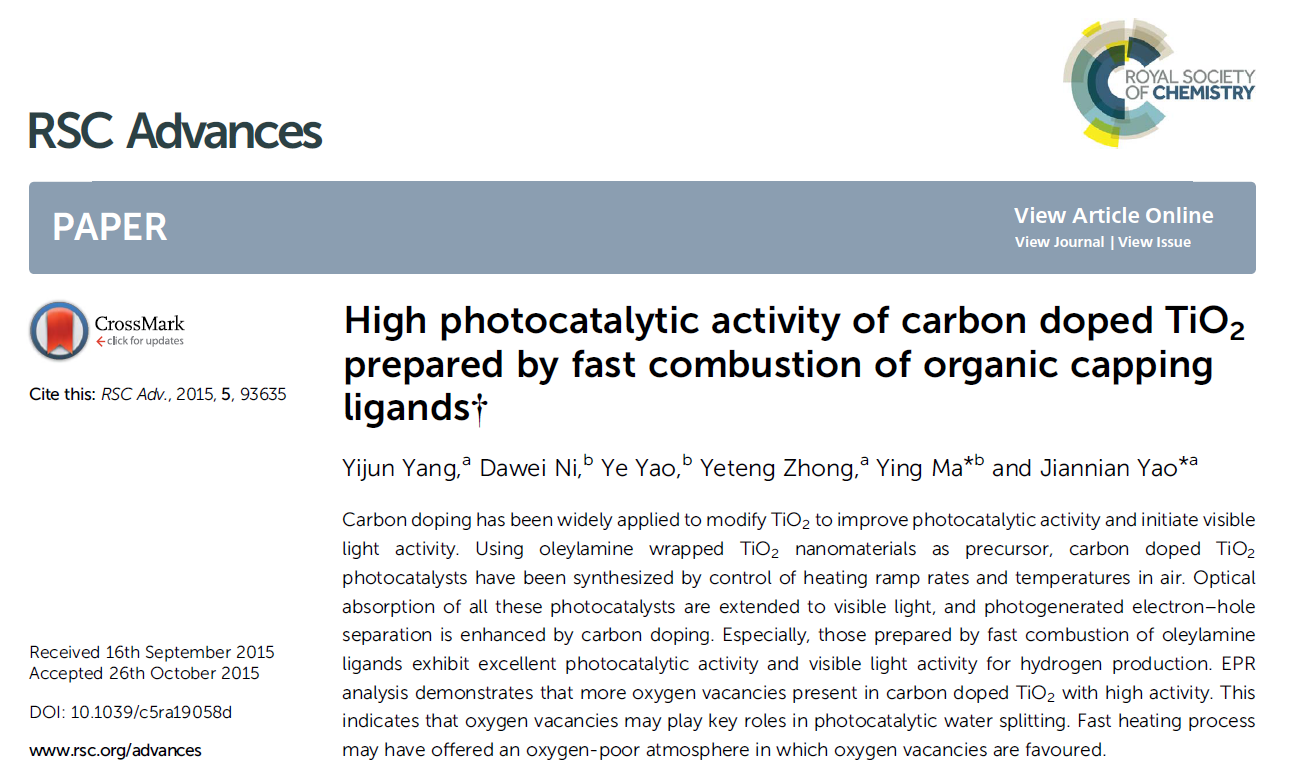 當(dāng)前(qián)位置 : 首頁 > 資訊動態 > 論(lùn)文發表 > High photocatalytic activity of carbon doped TiO2 prepared by fast combustion of organic capping ligands†