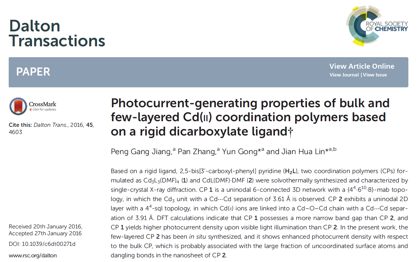 當前位置 : 首頁 > 資訊動態 > 論文發表 > Photocurrent-generating properties of bulk and few-layered Cd(II) coordination polymers based on a rigid dicarboxylate ligand†