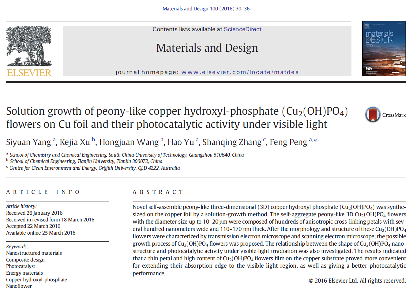 當前(qián)位(wèi)置 : 首頁 > 資訊動態 > 論文發表 > Solution growth of peony-like copper hydroxyl-phosphate (Cu2(OH)PO4) flowers on Cu foil and their photocatalytic activity under visible light