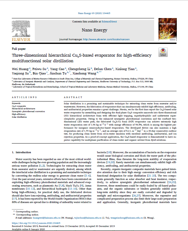 當前(qián)位置 : 首(shǒu)頁 > 資訊動態 > 論文發表 > Three-dimensional hierarchical CuxS-based evaporator for high-efficiency multifunctional solar distillation